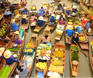 Desayuno en el hotel. Salida por carretera hacia el Mercado del Tren, uno de los lugares más curiosos que visitarás durante vuestro viaje a Tailandia. A continuación, nos dirigiremos hacia el mercado flotante de Damnoern Saduak. Llegada y paseo en lancha por los canales de tan famoso mercado. Allí podréis conocer la vida típica en Tailandia a orillas del río con sus casas flotantes y toda la actividad que transcurre en los canales. Proseguimos hacia Kanchanaburi. Almuerzo. Seguidamente tomaréis el famoso tren de la muerte, que recorre las vías construidas por los prisioneros aliados durante la II Guerra Mundial y desde el que podréis admirar unos bellos paisajes. Llegada a la estación y continuación por carretera hacia el hotel. Tiempo libre.