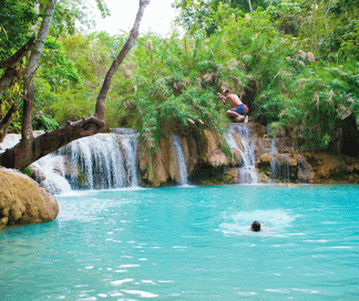 Después del almuerzo, traslado en vehículo privado a la cascada Khouang Si. En el camino, puede visitar al grupo étnico minoritario de Laos en Ban Na Ouane Village, H'Mong Village. Una vez en las cataratas, realice una caminata tranquila por el parque nacional hacia las cataratas Khouang Si y pase por el centro de rescate de osos asiáticos. Disfrutará sintiendo la niebla de las frescas aguas turquesas de las diferentes cataratas. Es posible nadar en las refrescantes aguas. Regrese a la ciudad al final de la tarde para ver el atardecer en Wat Phabath. Noche en Luang Prabang
