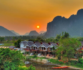 Una vez que hayas terminado de navegar en kayak, tomaremos un camión hasta la famosa Laguna Azul, donde tendrás la oportunidad de nadar en la laguna o simplemente relajarte en las pequeñas cabañas de bambú. Después, regresaremos a Vang Vieng para finalizar el recorrido. Noche en Vang Vieng