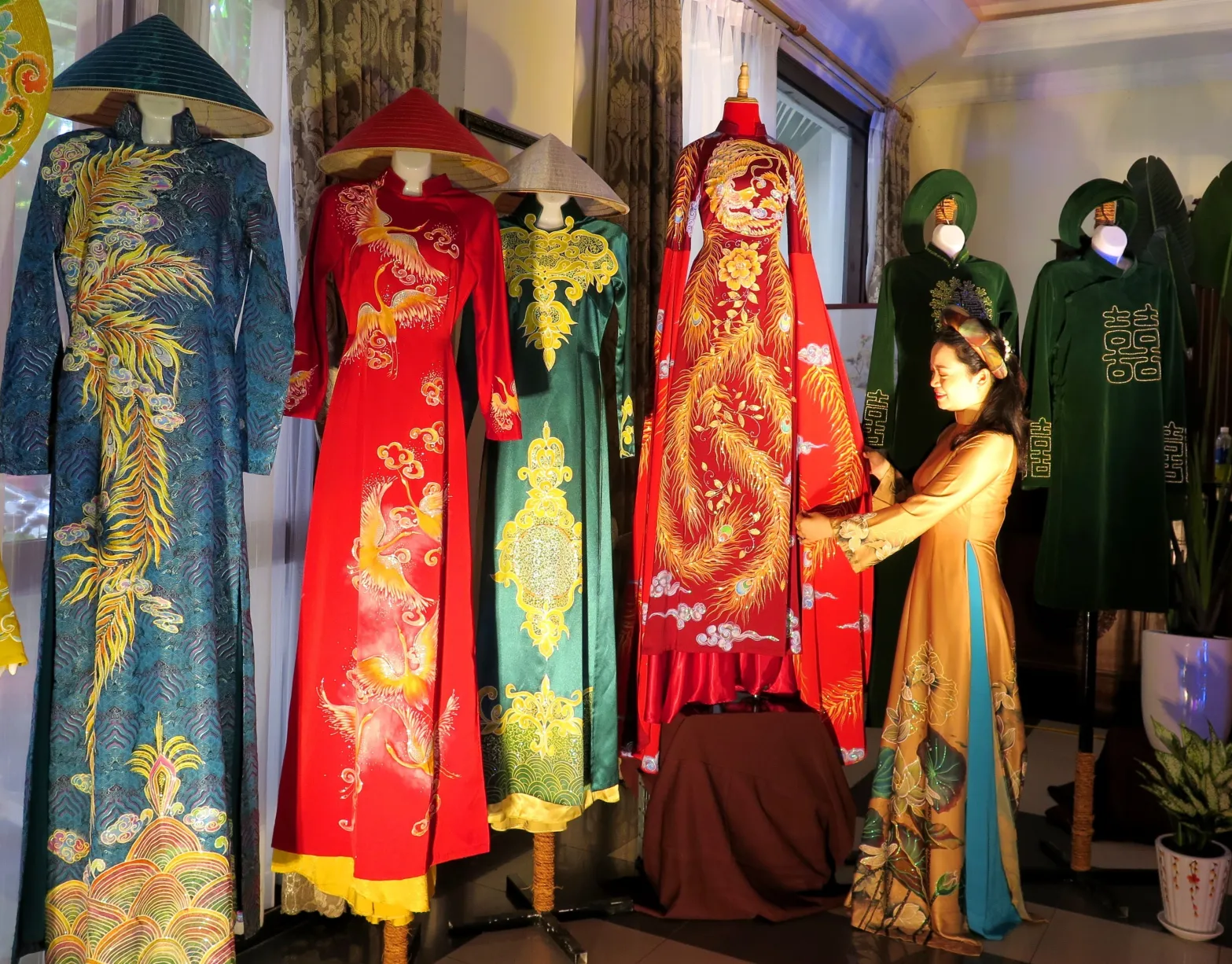 El traje nacional más popular y ampliamente reconocido de Vietnam es el Áo Dài. El Áo Dài fue utilizado por ambos géneros en el pasado, pero hoy en día es principalmente un atuendo femenino, salvo en algunas ocasiones culturales tradicionales importantes, en las que algunos hombres también lo visten. El Áo Dài tiene su origen en el Qipao chino, aunque se compone de un vestido largo con una abertura en ambos lados, que se lleva sobre pantalones de algodón o seda. El Áo Dài es elegante y cómodo de llevar. Se cree que el Áo Dài se originó en el siglo XVIII o en la corte real de Huế. El Áo Dài blanco es el uniforme obligatorio para las chicas en muchas escuelas secundarias de Vietnam. Algunas trabajadoras de oficina (por ejemplo, recepcionistas, secretarias, guías turísticas) también deben usar el Áo Dài.