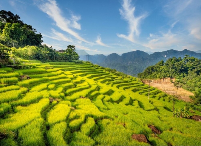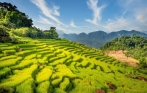 Desayuno en el hotel. Conducimos hacia Pu Luong (aprox 4 horas). Llegada a Pu Luong, tomamos un paseo por las aldeas del valle, disfrutando la belleza preservada de un entorno pacífico y pintoresco, donde la vida rural continúa arrullada por el ritmo de las estaciones. Visitamos el arroyo Cham, una hermosa zona de arrozales con ruedas de agua de bambú. Nos acercamos para ver cómo se mueve el agua del río a los acueductos. Experimenta el el rafting en bambú a lo largo del tranquilo río. Noche en Pu Luong.